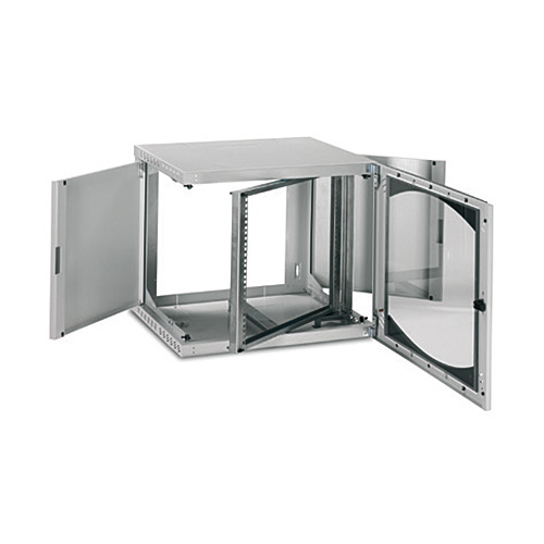Boîtier mural en tôle d'acier pliée et soudée. Boîtier composé d'un corps, de 2 panneaux latéraux rabattables et amovibles et d'un cadre pivotant de 19".